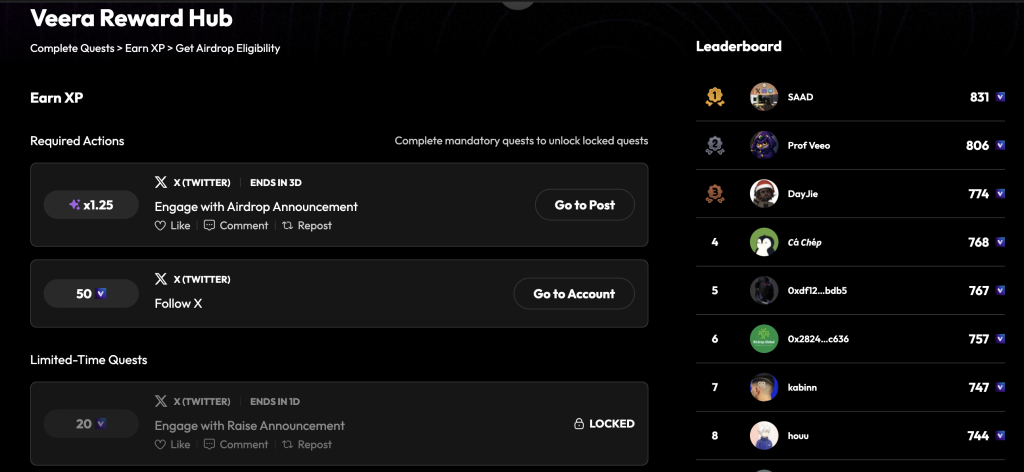 Veera has announced a hub with social tasks. Users are expected to complete tasks, earn XP, and climb the leaderboard. Here is how to participate: